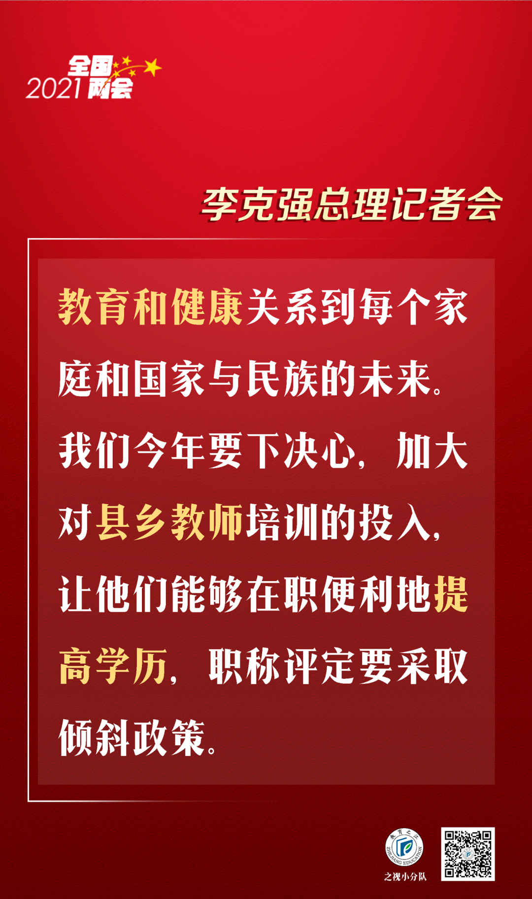 教育和健康关系到每个家庭和国家与民族的未来。我在两会参加代表团讨论时,一位中学校长说:现在县乡中学还缺乏优质的教师资源,教师的待遇不高,学历也很难提高。我们今年要下决心,加大对县乡教师培训的投入,让他们能够在职便利地提高学历,职称评定要采取倾斜政策。对于在城市的农民工子弟,只要拿到居住证,一定要让他们有受教育的机会。决不能因为家境、区域不同让孩子输在起跑线上。机会公平中,教育公平是最大的公平。