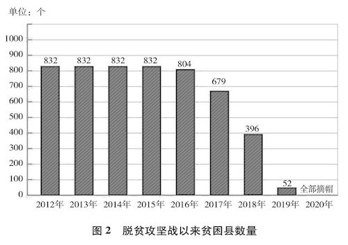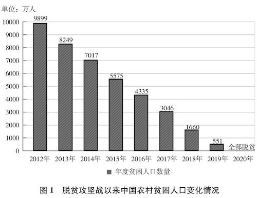 中共十八大以来,经过8年持续奋斗,到2020年底,中国如期完成新时代脱贫攻坚目标任务,现行标准下9899万农村贫困人口全部脱贫(图1),832个贫困县全部摘帽(图2),12.8万个贫困村全部出列,区域性整体贫困得到解决,完成消除绝对贫困的艰巨任务。
