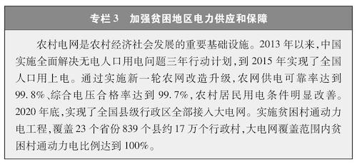 基础设施显著改善。出行难、用电难、用水难、通信难,是长期以来制约贫困地区发展的瓶颈。把基础设施建设作为脱贫攻坚基础工程,集中力量,加大投入,全力推进,补齐了贫困地区基础设施短板,推动了贫困地区经济社会快速发展。以建好、管好、护好、运营好农村公路(简称“四好农村路”,专栏2)为牵引,积极推进贫困地区建设外通内联、通村畅乡、客车到村、安全便捷的交通运输网络。截至2020年底,全国贫困地区新改建公路110万公里、新增铁路里程3.5万公里,贫困地区具备条件的乡镇和建制村全部通硬化路、通客车、通邮路,贫困地区因路而兴、因路而富。努力改善贫困地区水利基础设施条件,2016年以来,新增和改善农田有效灌溉面积8029万亩,新增供水能力181亿立方米,水利支撑贫困地区发展的能力显著增强。大幅提升贫困地区用电条件,实施无电地区电力建设、农村电网改造升级、骨干电网和输电通道建设等电网专项工程,把电网延伸到更多偏远地区,农村地区基本实现稳定可靠的供电服务全覆盖,供电能力和服务水平明显提升(专栏3)。加强贫困地区通信设施建设,贫困村通光纤和4G比例均超过98%,远程教育加快向贫困地区学校推进,远程医疗、电子商务覆盖所有贫困县,贫困地区信息化建设实现跨越式发展。基础设施的极大改善,从根本上破解了贫困地区脱贫致富的难题,畅通了贫困地区与外界的人流、物流、知识流、信息流,为贫困地区发展提供了有力的硬件支撑。