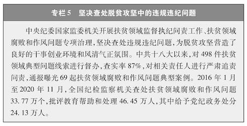 脱贫攻坚涉及面广、要素繁多、极其复杂,需要强有力的组织领导和贯彻执行。充分发挥党的政治优势、组织优势,建立中央统筹、省负总责、市县抓落实的脱贫攻坚管理体制和片为重点、工作到村、扶贫到户的工作机制,构建起横向到边、纵向到底的工作体系。各级党委充分发挥总揽全局、协调各方的作用,执行脱贫攻坚一把手负责制,中西部22个省份党政主要负责同志向中央签署责任书、立下军令状,省市县乡村五级书记一起抓。脱贫攻坚期内,贫困县党委政府正职保持稳定。有脱贫任务的地区,倒排工期、落实责任,抓紧施工、强力推进。脱贫攻坚任务重的地区,把脱贫攻坚作为头等大事和第一民生工程,以脱贫攻坚统揽经济社会发展全局。实行最严格的考核评估和监督检查,组织脱贫攻坚专项巡视,开展扶贫领域腐败和作风问题专项治理(专栏5),加强脱贫攻坚督导和监察(专栏6),确保扶贫工作务实、脱贫过程扎实、脱贫结果真实,使脱贫攻坚成果经得起实践和历史检验。建立健全干部担当作为的激励和保护机制,加大关心关爱干部力度,树立正确用人导向,引导广大干部在决胜脱贫攻坚中奋发有为、履职尽责。加强基层扶贫队伍建设,普遍建立干部驻村帮扶工作队制度,按照因村派人、精准选派的原则,选派政治素质好、工作能力强、作风实的干部驻村扶贫。广大驻村干部牢记使命、不负重托,心系贫困群众,扎根基层扶贫一线,倾心倾力帮助贫困群众找出路、谋发展、早脱贫。从2013年开始向贫困村选派第一书记和驻村工作队,到2015年,实现每个贫困村都有驻村工作队、每个贫困户都有帮扶责任人。截至2020年底,全国累计选派25.5万个驻村工作队、300多万名第一书记和驻村干部,同近200万名乡镇干部和数百万村干部一道奋战在扶贫一线。