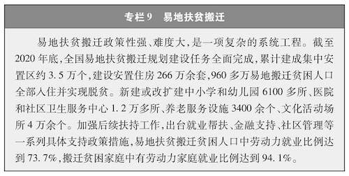 易地搬迁脱贫一批。对生活在自然环境恶劣、生存条件极差、自然灾害频发地区,很难实现就地脱贫的贫困人口,实施易地扶贫搬迁(专栏9)。充分尊重群众意愿,坚持符合条件和群众自愿原则,加强思想引导,不搞强迫命令。全面摸排搬迁对象,精心制定搬迁规划,合理确定搬迁规模,有计划有步骤稳妥实施。960多万生活在“一方水土养不好一方人”地区的贫困人口通过易地搬迁实现脱贫。对搬迁后的旧宅基地实行复垦复绿,改善迁出区生态环境。加强安置点配套设施和产业园区、扶贫车间等建设,积极为搬迁人口创造就业机会,保障他们有稳定的收入,同当地群众享受同等的基本公共服务,确保搬得出、稳得住、逐步能致富。