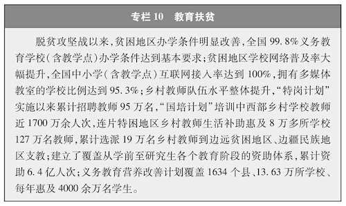 发展教育脱贫一批。坚持再穷不能穷教育、再穷不能穷孩子,加强教育扶贫,不让孩子输在起跑线上,努力让每个孩子都有人生出彩的机会,阻断贫困代际传递(专栏10)。持续提升贫困地区学校、学位、师资、资助等保障能力,20多万名义务教育阶段的贫困家庭辍学学生全部返校就读,全面实现适龄少年儿童义务教育有保障。实施定向招生、学生就业、职教脱贫等倾斜政策,帮助800多万贫困家庭初高中毕业生接受职业教育培训、514万名贫困家庭学生接受高等教育,重点高校定向招收农村和贫困地区学生70多万人,拓宽贫困学生纵向流动渠道。开展民族地区农村教师和青壮年农牧民国家通用语言文字培训,累计培训350万余人次,提升民族地区贫困人口就业能力。“学前学会普通话”行动先后在四川省凉山彝族自治州和乐山市马边彝族自治县、峨边彝族自治县、金口河区开展试点,覆盖43万学龄前儿童,帮助他们学会普通话。
