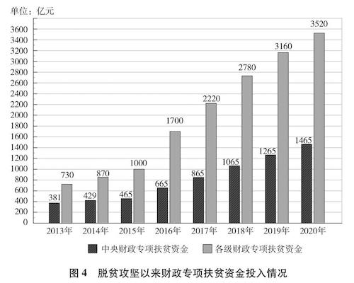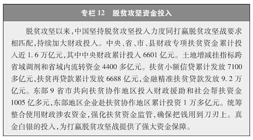 贫困地区发展条件差,贫困人口自我发展能力弱,消除贫困仅仅依靠个体、区域、民间等力量远远不够,必须作为执政党和国家的责任,上升为国家意志、国家战略、国家行动。中国共产党始终把消除贫困作为定国安邦的重要任务,制定实施一个时期党的路线方针政策、提出国家中长期发展规划建议,都把减贫作为重要内容,从国家层面部署,运用国家力量推进。几代中国共产党人,锚定一个目标,一茬接着一茬干。中共十八大以来,中国共产党把脱贫攻坚摆在治国理政的突出位置,加强党的集中统一领导,统筹谋划、强力推进。从党的领袖到广大党员干部,情系贫困群众、心怀减贫大业,全党目标一致、上下同心。加强顶层设计和战略规划,制定印发《关于打赢脱贫攻坚战的决定》《关于打赢脱贫攻坚战三年行动的指导意见》等政策文件,明确目标、路径和具体措施并一以贯之抓下去。各级财政不断加大投入力度(图4),构建多元资金投入体系(专栏12),为减贫事业发展提供资金保障。发挥社会主义制度集中力量办大事的优势,广泛动员各方力量积极参与。建立脱贫攻坚责任体系、政策体系、组织体系、投入体系、动员体系、监督体系、考核评估体系等制度体系,为脱贫攻坚顺利推进提供了有力支撑。