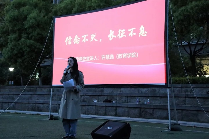 在影片开始之前,00后党史宣讲人教育学院2018级许慧逸同学结合湘江战役故事缅怀先烈,用激扬的演讲弘扬“长征精神”,号召广大青年学生承担时代责任,共谋民族复兴。现场短短5分钟的微党史宣讲大大调动了同学们观看红色影片学习党史的热情。