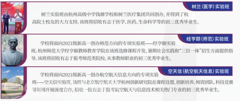 经亨颐(师范)实验班是杭高钱塘“4+N”特色实验班中的一个。从与树兰医疗集团共建“树兰(医学)实验班”,到与北航杭州创新研究院共建“空天信(航空航天信息)实验班”,再到今天与杭师大经亨颐学院共建“经亨颐(师范)实验班”,“N”的内涵不断具体,不断丰富,这也是杭高钱塘学校立意“高位育人”,持续纵深个性教育的创新举措。
