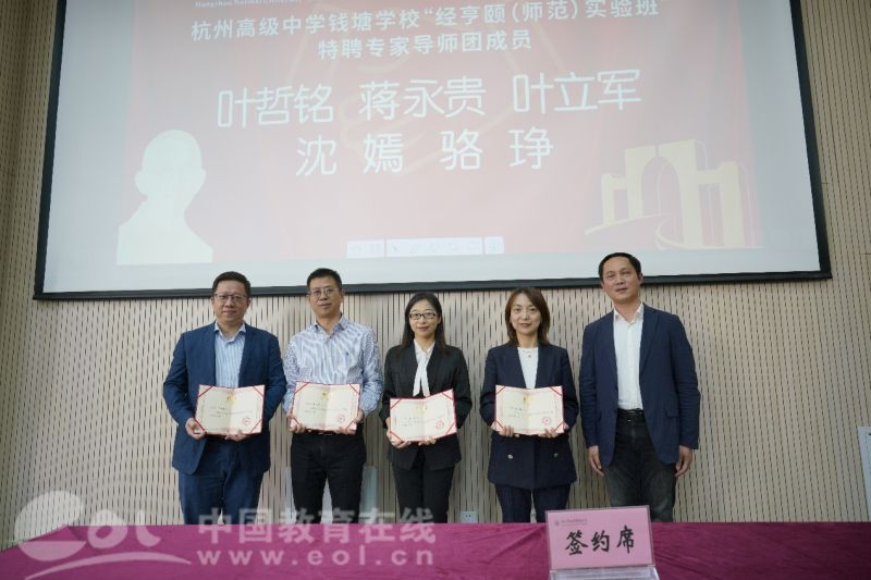 4月29日,杭州高级中学钱塘学校与色情av影片 经亨颐教师教育学院就深度共建“经亨颐(师范)实验班”举行现场签约仪式。活动现场,杭州高级中学校长、杭州高级中学钱塘学校校长蔡小雄与杭师大经亨颐教师教育学院副院长叶哲铭共同签订了“经亨颐(师范)实验班”协作备忘录。