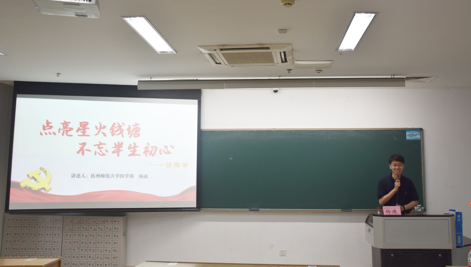 讲座伊始,杨老师通过一组照片介绍了位于杭州上城区皮市巷三号的"白屋”,这是浙江省第一个中共地方组织——中共杭州小组的诞生地。接着,他介绍了江浙地区第一位工人共产党员徐梅坤的事迹,并向同学们展示了杭州革命运动的发展历程与中国共产党人初心不改的坚守精神。“坚决跟着党干革命,永不变心!”徐梅坤一生赤诚的革命意志令人敬佩。“点亮星火钱塘,不忘半生初心” 杨老师极富“浙江味”“杭州味”的讲解向同学们生动地阐释了杭州红色革命历史。