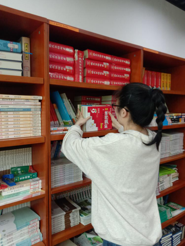 【俞婷婷】在小学见习期间,学校为我们一行人配备了教师休息室。我们学校的地点位于教师资料室。这是一个长久不大有人使用的阅览室。有一天发现里面的书架因为长久无人使用积灰了,分类也比较杂乱。所以想着可以顺便帮忙收拾一下。几个同学一起把书先按照分类大致分堆,再根据书脊的长短排列好。很快书架就整整齐齐了。