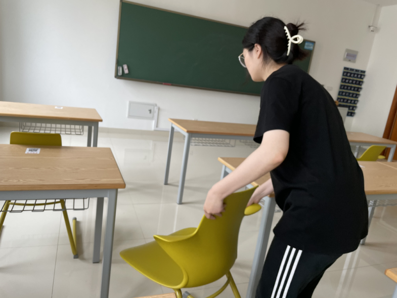 教室是同学们每天学习最主要的场所,一个教室每天都排着不同的课,同学们都进进出出。有的教室的座椅是固定的,同学们出入很方便,但有的教室的座椅不固定,并且摆放十分杂乱,同学们进出总是受到阻碍。曾经被没有放好的椅子绊倒过的许含笑在本次点亮微心愿中进行的就是摆放椅子的工作,将杂乱的椅子摆放整理,方便了同学们。