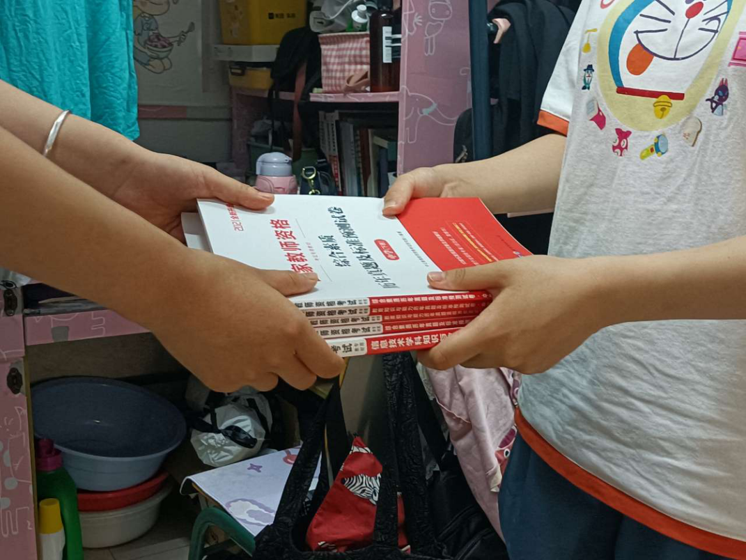 此次“微心愿”活动开展初期,我们组成员先向身边的同学发放心愿卡,征集了他们所需要的学习资料清单,具体的书籍由我们分别认领。当物资集结完毕后,于5月12日将学习资料送至各个同学的寝室,当同学们拿到资料后,脸上都洋溢着幸福的笑容。截止目前,第六组成员收到微心愿6个,达成微心愿6个,送出了不同的学习资料,如大学生英语六级考试资料,考研学习资料,教师资格证资料等,切实帮助了这些有需求的同学。