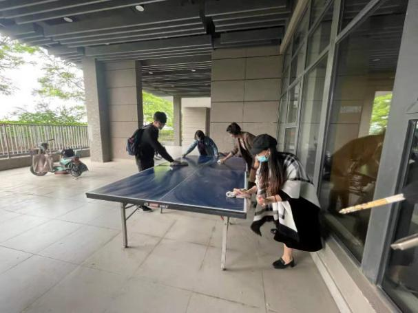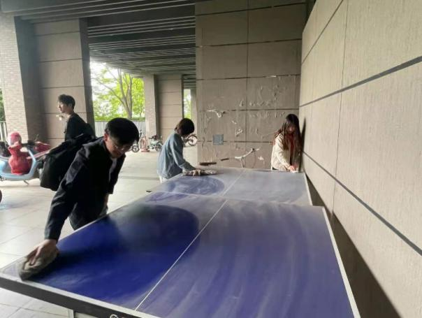 4月24日下午,党员发展对象第十小组成员来到博文苑10号楼下,对寝室楼外部的若干乒乓球台进行了清理打扫。这里是同学们进行休闲运动的场地,常有同学在此练习打乒乓球。然而由于乒乓球台都在室外,桌子上很容易遍布灰尘,球台现在几乎已处于“被闲置”的状态。经过成员们的打扫清理,乒乓球台焕然一新,不仅可以给同学们提供一个更为舒适的休憩之地,更增强了小组成员为身边师生服务的“初心”,大家都表示将以更加饱满的精神状态投入到日常的学习与工作活动中去。