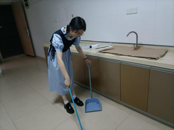 何霞和陈珺同学选择了宿舍楼道的开水房。平时,开水房经常有同学有进行小组汇报的排练,会有同学写毛笔字,也会有同学在学习。因此,良好的开水房环境是很必要的。何霞同学进行扫地、拖地、擦桌子等一系列的劳动,让开水房变得更加干净整洁。