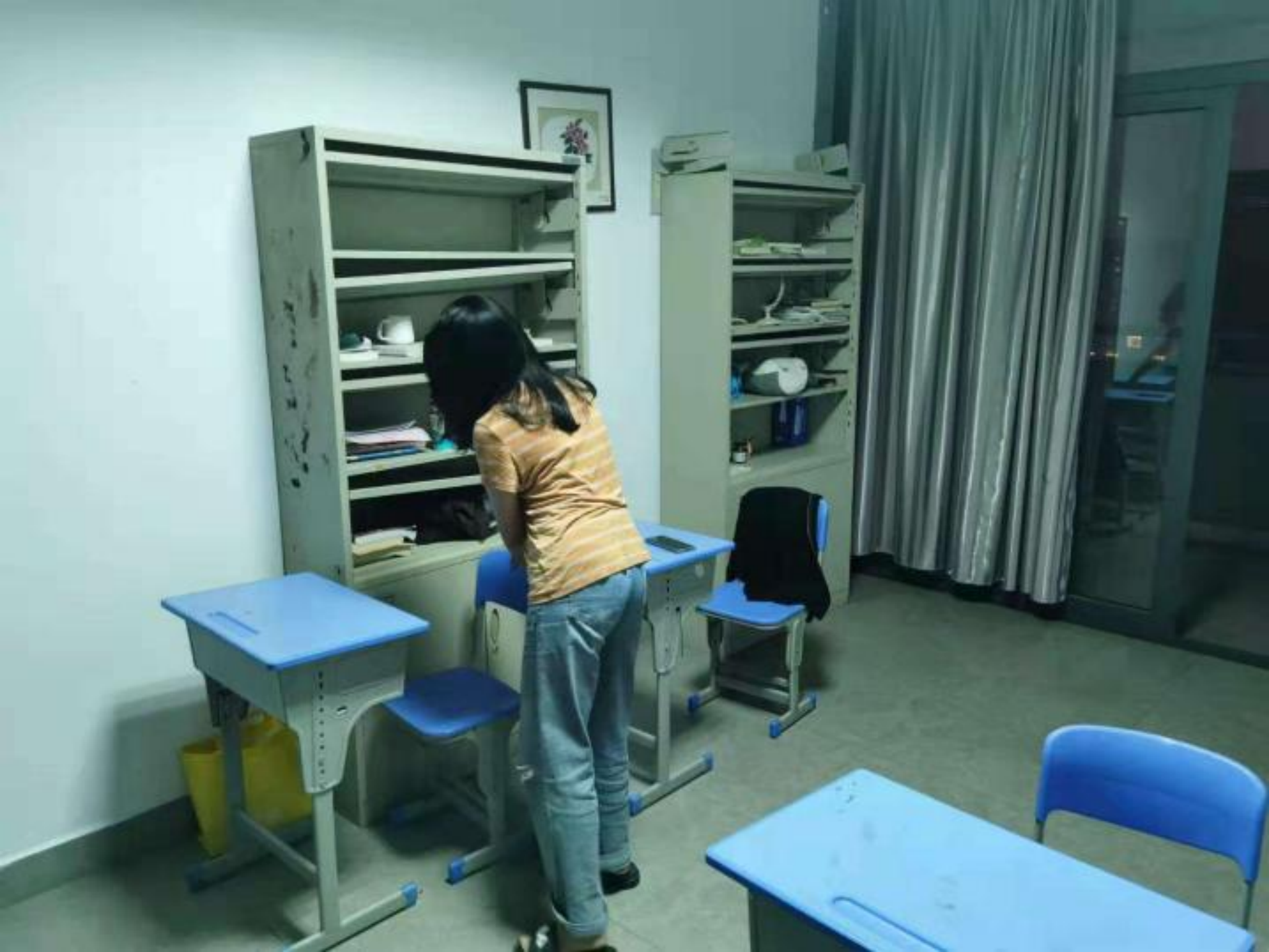 冯龙顺同学选择的则是博文苑八号楼2楼的教育学院。同样是寝室楼里同学们活动的场所,营造良好的活动环境也是至关重要的。冯龙顺主要对地面进行了拖洗,另外也注意对一些平日的卫生死角例如柜子进行清洗、打扫。