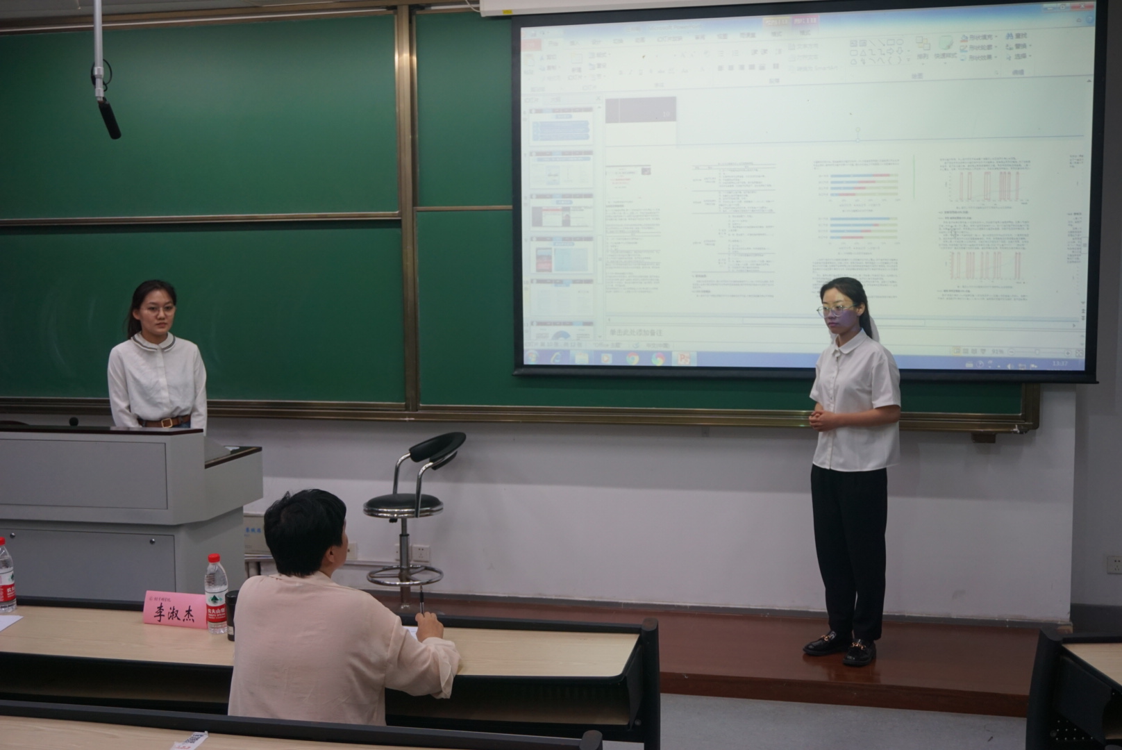 最后两支队伍是由陆吉健老师指导的《在线一对一可视化辅导的交互行为反馈研究》和《人工智能辅助课堂教学视频可视化分析研究》,负责人为任希畅、施念同学。两支队伍都以课堂可视化探究为切入点,分别探究了线上一对一课堂的交互行为和人工智能辅助下的学生课堂状态,将科学技术与师范生技能相结合,视角新颖。