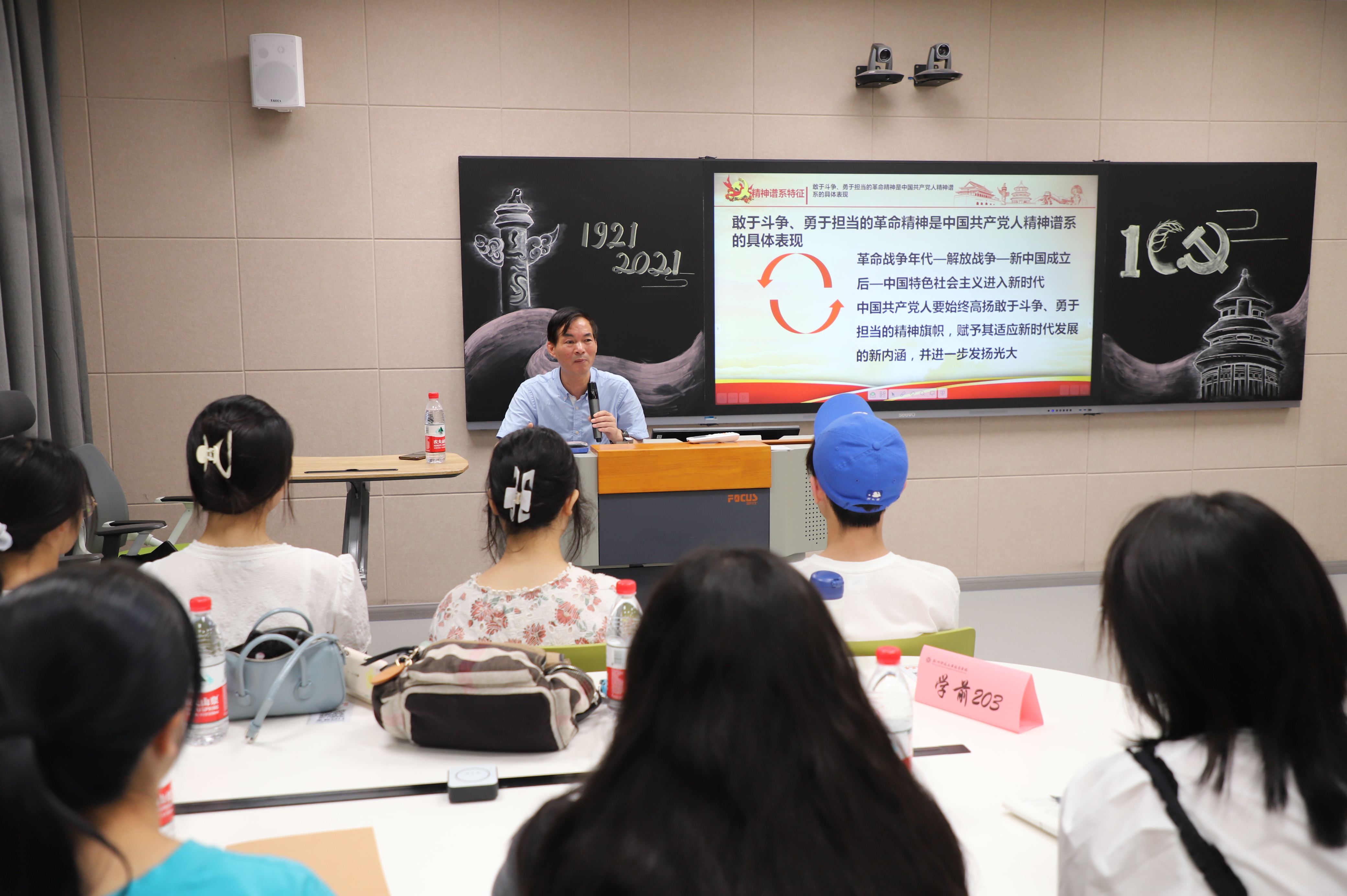 陈永富副校长从习近平总书记的论述出发,为在座的师生梳理了中国共产党人精神谱系的发展。从源头的红船精神说起,中国共产党在红船中诞生这一伟大革命实践所表现出来“开天辟地、敢为人先”的首创精神、“坚定理想、百折不挠”的奋斗精神、“立党为公、忠诚为民”的奉献精神;再到“信念的能量、大爱的胸怀、忘我的精神、进取的锐气”的雷锋精神;“敢闯敢试、敢为人先、埋头苦干”的特区精神以及“生命至上、举国同心、舍生忘死、尊重科学、命运与共”的抗疫精神等等。中国共产党诞生以来,中国革命从此有了坚定的理想信念和强大的精神支柱,中国共产党人的精神谱系炫目多彩,犹如鲜活生动的历史链条,把中国共产党的伟大精神串接起来,展现了党带领中国人民艰苦奋斗、开辟中国特色社会主义道路的精神脉络。中国共产党人的精神谱系是党的宝贵精神财富,是中国共产党人践行初心使命的生动写照,是中国特色社会主义事业不断发展的强大动力。