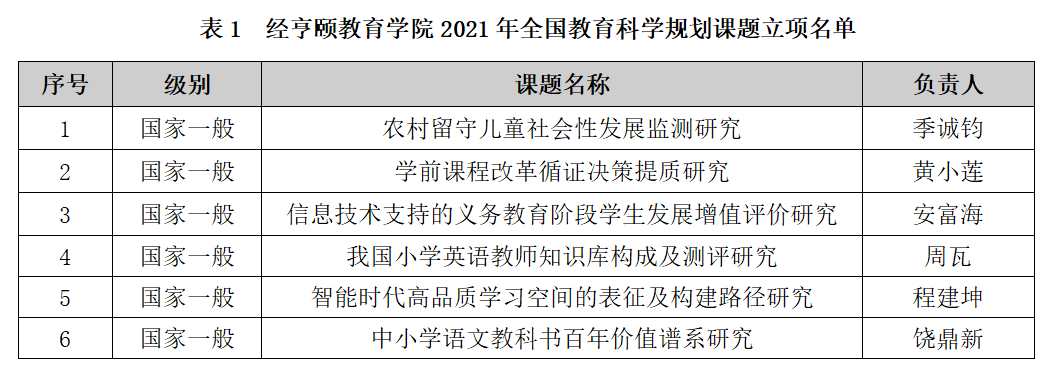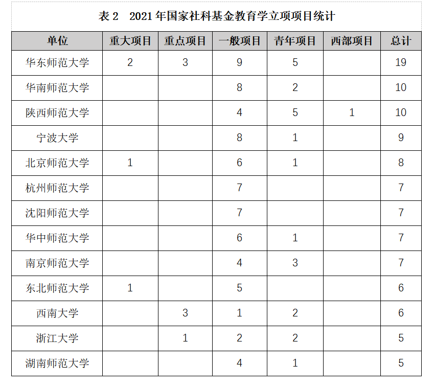 近日,全国教育科学规划领导小组办公室公布了全国教育科学“十四五”规划2021年度课题立项名单,色情av影片 季诚钧、黄小莲、安富海、周瓦、程建坤、饶鼎新6位老师获批国家一般项目(名单如表1),立项总数创学院历史新高。据悉,我校此次共获得7项国家一般项目立项,其中,我院获批项目总数6项,贡献率高达86%,立项数与沈阳师范大学、华中师范大学、南京师范大学并列位居全国高校第6位(如表2)。