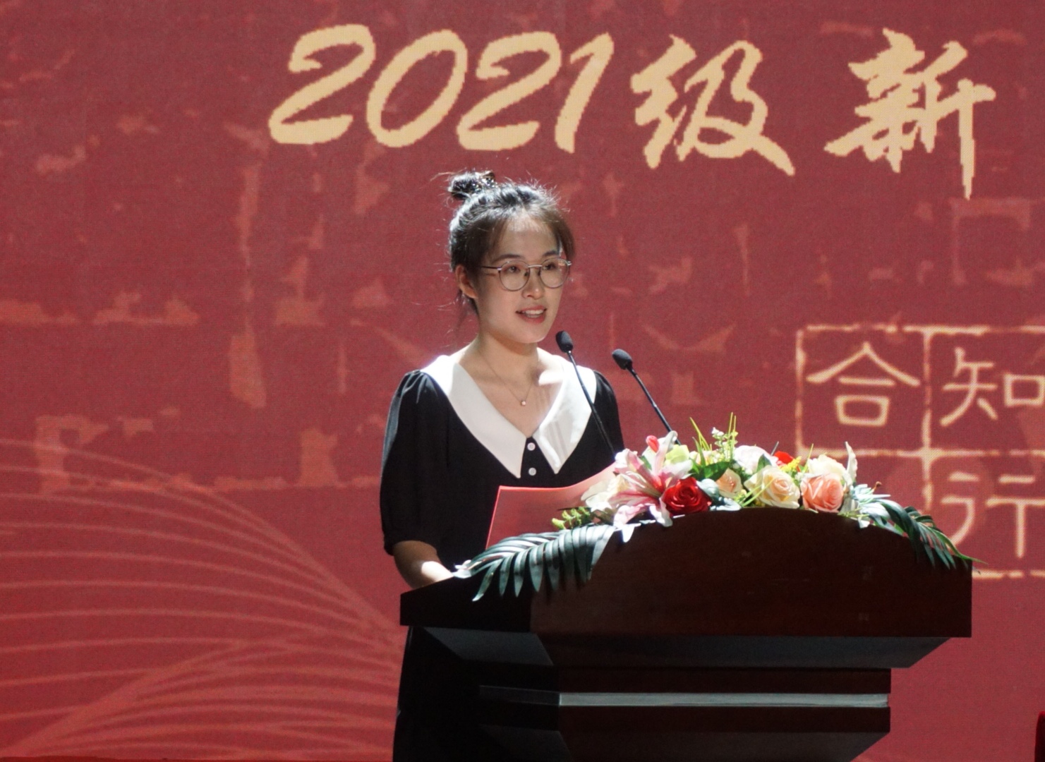 心理211班的洪冉冉同学代表所有新生进行了发言,首先她表达了对所有默默付出的父母老师诚挚的谢意,之后她阐述了学院精神和教学思想并立志永远保持对教育的热忱之心,终身学习,开拓视野,不负百年教院的传世荣光。
