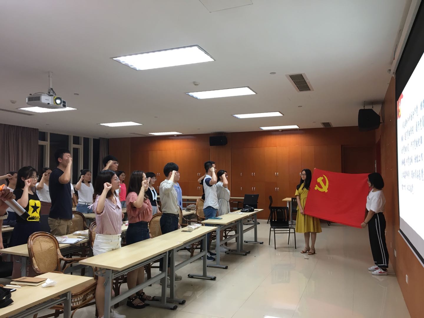 党史知识竞赛内容涵盖了中国共产党成立历史,指导思想,革命斗争过程以及十九大报告等多方面内容。题型包含了选择题、判断题、填空题,难度逐渐增加。各小组成员积极参与,争相抢答。这一环节显示出各位党员对党史时政知识掌握度比较高,也让各位党员再次学习有关党的知识,用知识竞赛的方式巩固理论学习。入党故事分享环节,主持人随机抽取了四位党员同志的入党时间,由他们给其他同志分享了不同的入党心路历程。其中,2016级学术硕士党支部党员刘志同志和廖娟同志分享了他们在浙江革命烈士纪念馆的特殊入党仪式,刘志同志还在那一日参与献血活动,赢得广大党员的阵阵掌声。另外两个支部的张又予同志和李攀攀同志也分享入党历程,重温入党初心,引发其它党员的共鸣。最后一个环节是重温入党誓词。各位党员庄重地右手握拳,再次对着党旗宣誓:“我志愿加入中国共产党,拥护党的纲领……随时准备为党和人民牺牲一切,永不叛党。”