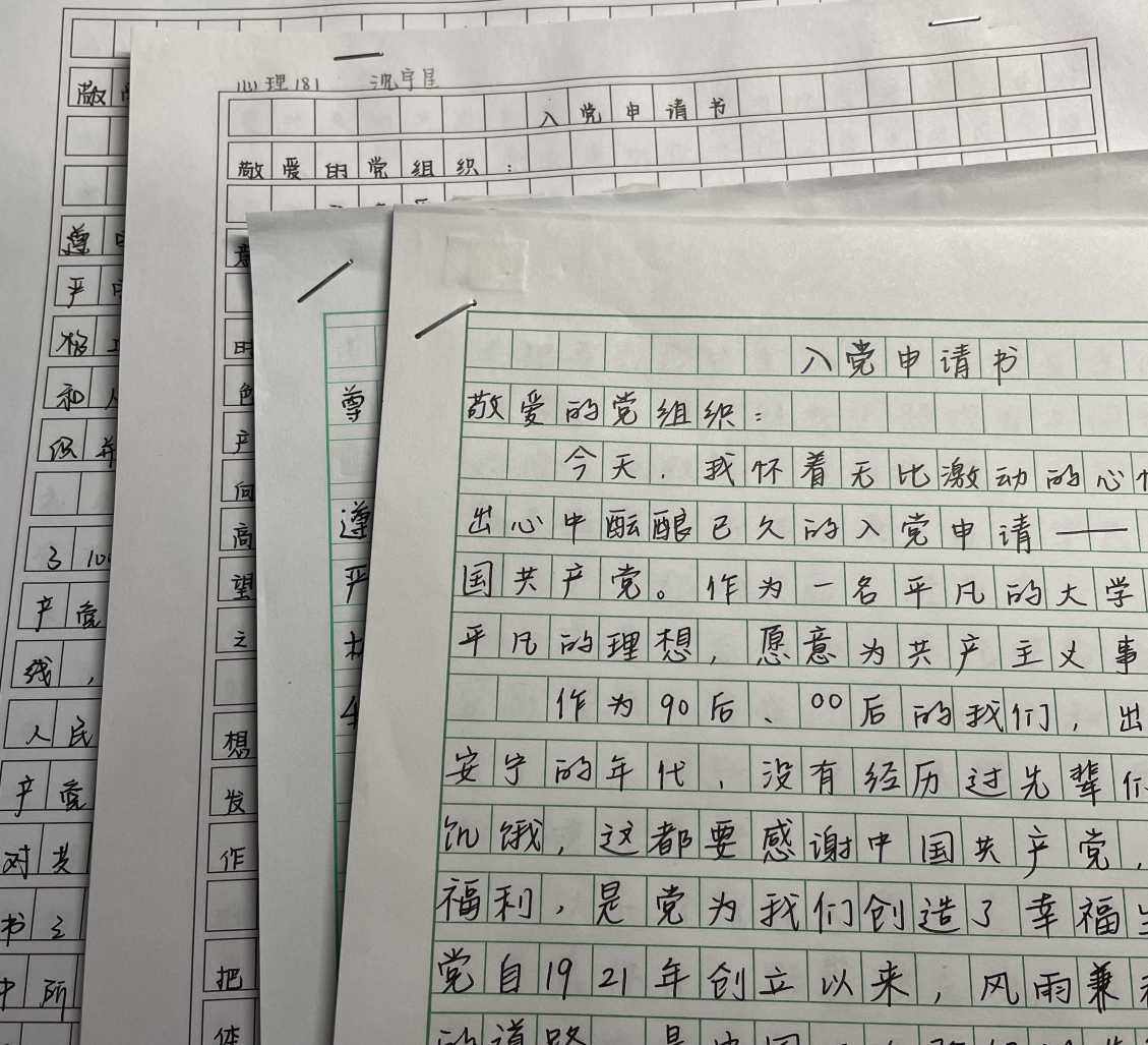 在本次活动中,支部党员们各自重温了自己的入党申请书,再次书写了自己的入党申请书。本次活动也让支部的同学感受颇深,心理181的唐小雅同志感到:“重写了入党申请书,我再一次感觉到中国共产党的伟大,愿早一日成为中国共产党中的一员!”特教181的卢雪艳同志说:“陪伴我的有最初这份入党申请书。作为一名预备党员,我要将自己的理想和祖国的前途命运结合起来,坚决拥护共产党领导,紧跟共产党并使自己成为其中一员,以优秀共产党员为人生目标,从自我做起,努力向先进共产党员靠近,学习他们的优秀品质,理解他们的伟大抱负,将自己的力量与激情奉献给广大群众。”应用心理学191的易佳琦感到:“时隔两年,再次写下入党申请书,感触良多。重温誓词,我感受到了当初宣誓时难以言表的激动,这像是火一样在心底燃烧。”