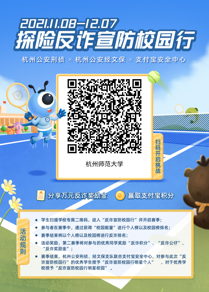 根据杭州市公安局、支付宝安全中心《关于开展在杭高校“反诈宣防校园行”第二季答题活动的通知》相关要求和我校反诈工作实际,为进一步营造平安、和谐、健康的校园环境,深化平安校园建设,增强广大师生防诈骗意识,我校决定积极响应组织参与。请各学院(部)、部门务必重视反诈工作和本次活动,从保障师生财产安全出发,全面发动全体师生参与,本次活动将进行校内排名与学校间排名。活动具体内容如下: