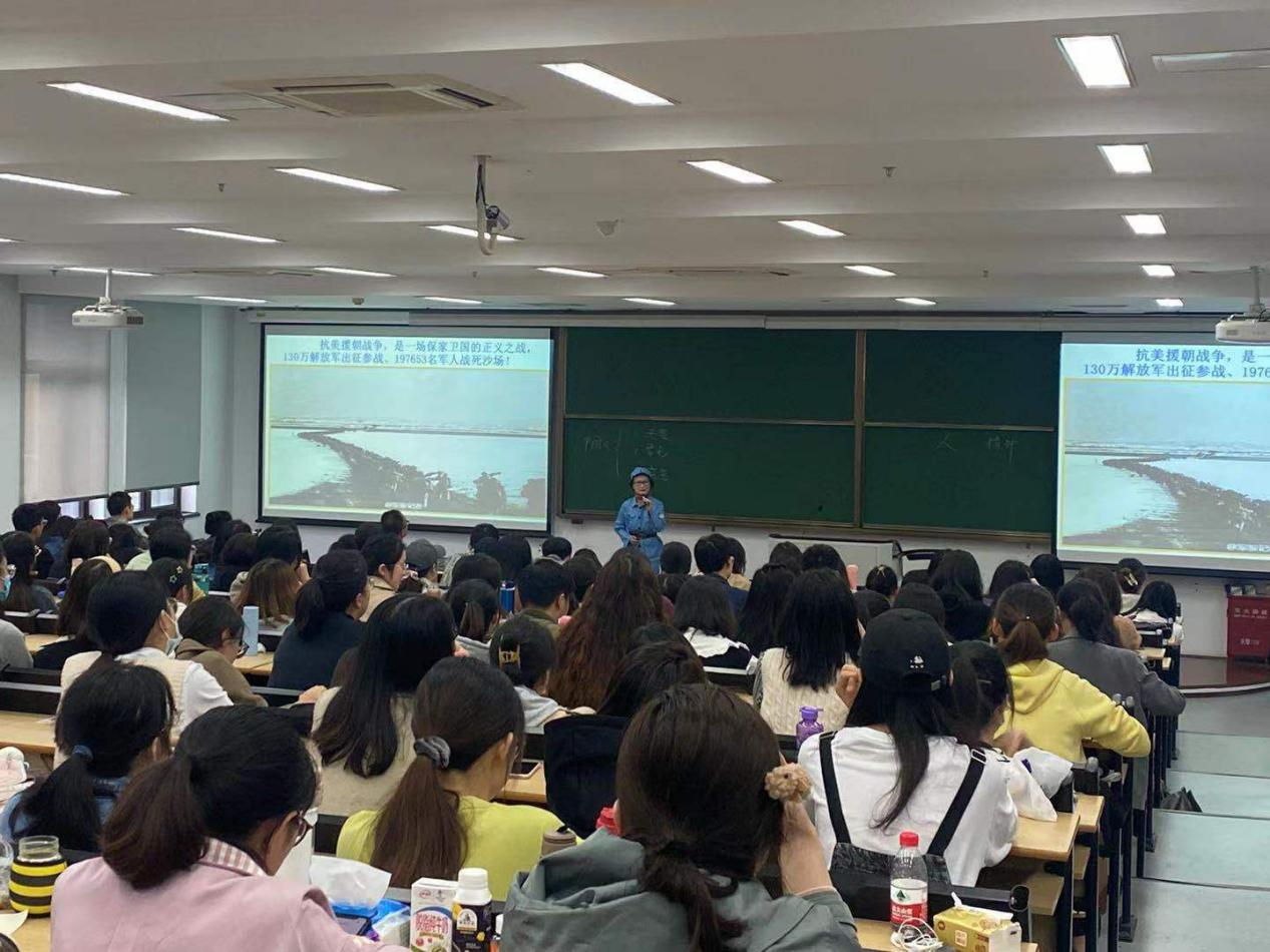 沈如如老师身着新四军军服,用充满感情的声音将抗美援朝的故事娓娓道来,她激昂深情的讲述中保饱含着对战士们的敬佩与怀念。黄继光不顾自己安危,迎着硝烟咬牙站定,用胸膛抵住敌人的炮火;冰雕连在零下四十摄氏度的暴雪中匍匐在雪地冰面,保持着战斗的姿势,直至化成冰雕……先辈们在条件艰苦,敌我军备差距悬殊的战场上浴血奋战,砥砺奋进的这种坚毅是时代的精神;中国新一代的青年在和平的年代不骄不馁,勇于担当,以自身的努力为时代精神赋予新的内涵,这也是时代的精神。新时代的中国青年将会接过传承的火炬,以高昂奋进的大无私精神向着新时代的新目标前进,最终成就真正的大我。
