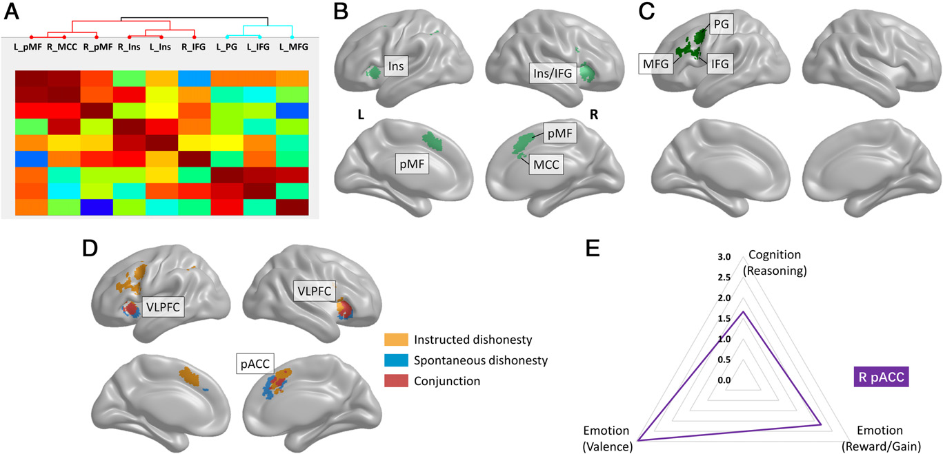 研究结果发现,相比诚实行为,说谎激活了更多与认知控制相关的脑区,如腹外侧前额叶(VLPFC),前部扣带回(ACC)和背外侧前额叶(DLPFC)。表明说谎需要更多的认知控制,支持了Grace理论。另外,通过比较自发说谎和被动说谎发现,自发说谎和被动说谎都激活了腹外侧前额叶(VLPFC),但只有自发性说谎激活膝周侧前部扣带回(perigenual anterior cingulate cortex, pACC),表明pACC有可能是与说谎的蓄意加工有关。进一步的功能解码分析(Functional decoding analyses)表明 pACC常常在与情绪效价和认知推理有重要联系。这可能与个体在说谎决策时产生的道德内心冲突过程或者动机相关。