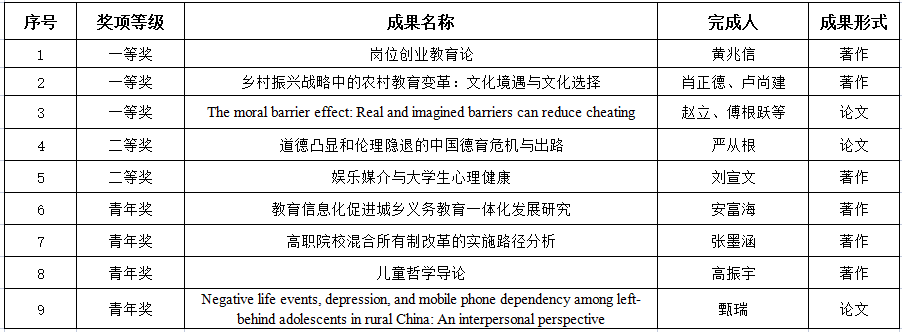 经组织申报、专家评审、成果公示等评选程序,第二十一届省哲学社会科学优秀成果奖结果已于2021年11月17日进行公示。我校共29项成果获奖,其中我院教育学和心理学两大学科共有9项成果获奖,包括一等奖3项、二等奖2项、青年奖4项(具体如下表),在获奖数量和等级方面均创学院历史新高。