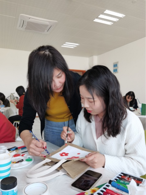 活动伊始,由“创意+”俱乐部方蕴捷老师、赵铭老师向老师们介绍制作麻绳手提包所需的材料、流程和一些注意事项,如:如何使用美纹胶,如何更好的给麻布包上色以及如何加快丙烯颜料的干燥的速度等。并就老师们在创作过程中提出的一些问题,进行指导和解答,使得所有老师都能很快上手进行创作,融入到此次活动中来。