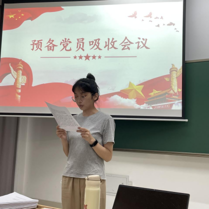 会议的第二部分为预备党员转正会议,各位预备党员通过宣读转正申请书,用简明扼要的语言概括了自己成为预备党员以来为加入党组织做出的改变与准备。党支部书记周健康对同学们的宣讲进行简要点评并对新发展党员及预备党员同志们都提出了作为党员同志应该达到的几点标准。
