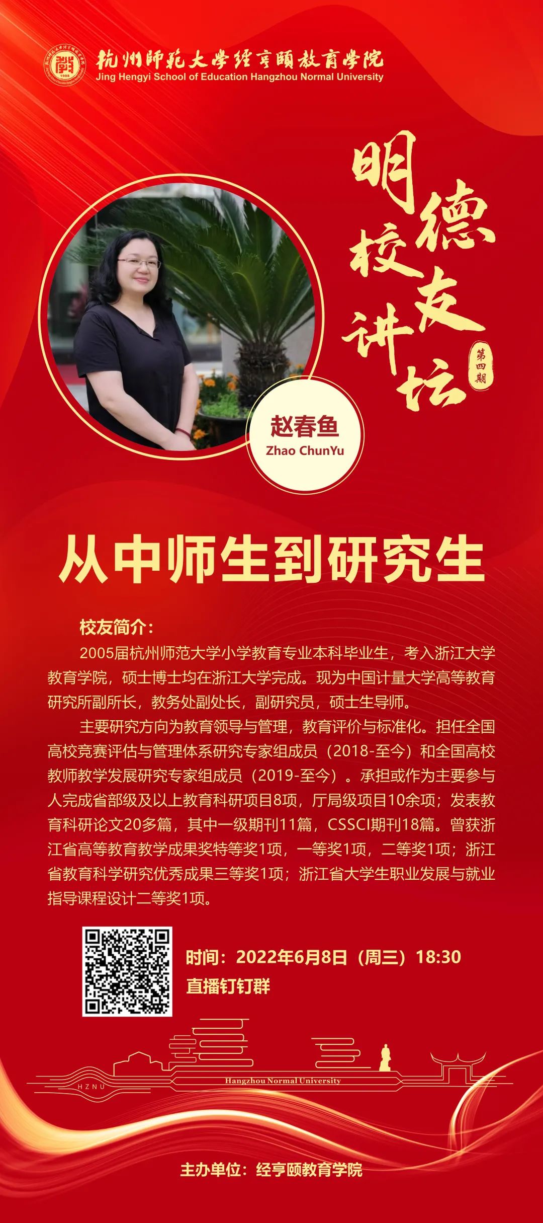 6月8日晚,我院开展“明德校友讲坛”第四期讲座,我院2005届毕业生、中国计量大学高等教育研究所副所长赵春鱼老师以“漫谈:从中师生到研究生”为题和同学们进行了深入的交流。学院党委书记蒋璐敏、副书记沈嫣参与本次讲座。