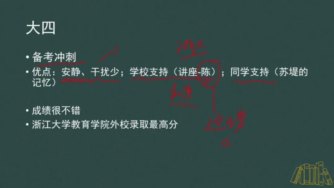 在确定以浙江大学为考研目标院校后,赵老师开始与同学一同积极备考。回想起那段时间,赵老师语气充满了怀念。因为英语不好,她利用一切碎片时间在小本子上记背英语单词。最终,她获得了浙江大学教育学院外校录取最高分。她认为杭师大的专业课学习为考研获得高分打下了坚实的基础。