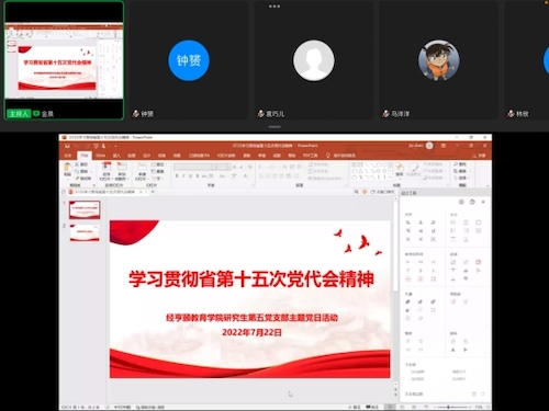 省第十五次党代会全面吹响“在高质量发展中奋力推进中国特色社会主义共同富裕先行和省域现代化先行”的冲锋号。为进一步学习好、领悟好省第十五次党代会精神,结合学院党委关于认真学习宣传贯彻党代会精神的有关要求,7月22日晚,我院研究生第五党支部于线上开展主题党日活动,支部党员集体学习研讨,并分享个人心得体会,进一步推动省党代会精神入脑入心、落地生根。