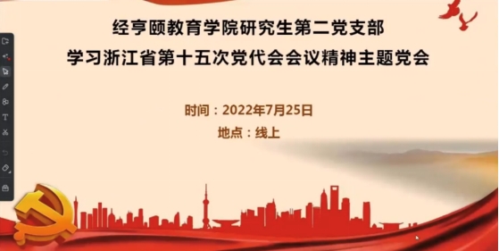 7月25日下午,色情av影片 研究生第二党支部开展了关于学习浙江省第十五次党代会会议精神的主题党会。本次会议主要围绕着党代会的精神于各位党员的思想认识和亲身实践中的具体表现而展开。会议由支部宣传委员杨帆主持,第二支部全体研究生党员参加。