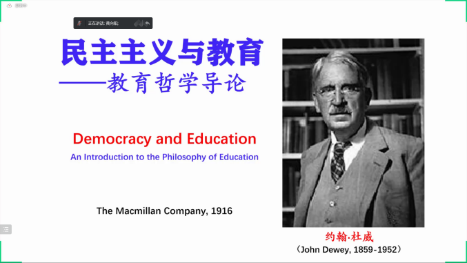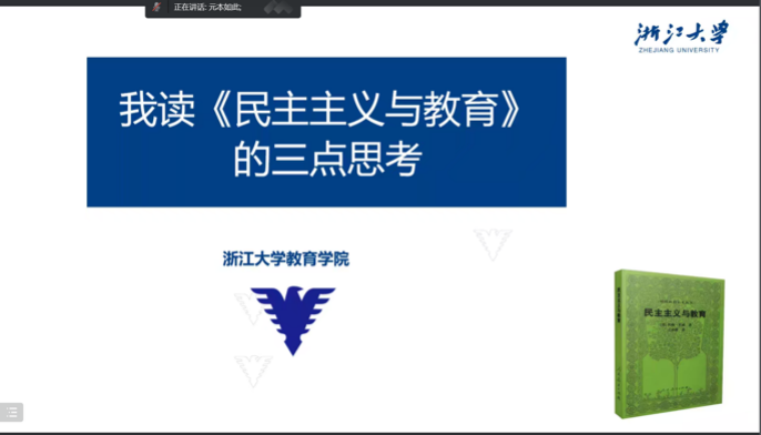 浙江大学教育学院副院长孙元涛教授在随后的呼应中,重点分享了他自己读《民主主义与教育》的三点思考。首先,孙教授指出,阅读《民主主义与教育》需要在杜威的教育学体系、哲学体系中扩展理解,深入阅读杜威的哲学著作和其他教育学著作,才能深化对《民主主义与教育》的认识。其次,孙教授认为,要在方法论意义上理解杜威。具体来说,要在“交互建构”中深化理解,充分认识杜威强调的“参与”“交互建构”的认识论;要在“连续性”中深化理解,深刻认识杜威强调的经验的连续性。“交互建构”和“连续性”构成了杜威思考经验问题的方法论“双翼”。最后,孙教授指出,要在“转向”中重建理解。我们要深刻认识杜威把他提出的“儿童中心”和行动(参与)的认识论称之为哥白尼式的革命的价值,同时要警惕要杜威在理论上的努力直接应用到实践中可能带来的危险。