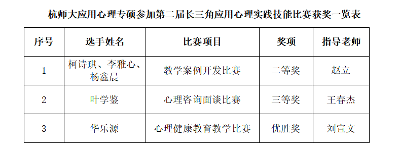2022年11月20日,应用心理专硕的柯诗琪李雅心杨鑫晨叶学鉴华乐源五位同学在浙江大学紫金港校区举办的第二届长三角MAP实践技能大赛中取得优异成绩,其中柯诗琪李雅心杨鑫晨组成的团队获得了应用心理教学案例比赛二等奖叶学鉴获得心理咨询面谈技能比赛等奖,华乐源获得了应用心理教学技能比赛优胜奖赵立王春杰刘宣文三位老师获得优秀指导教师荣誉称号。