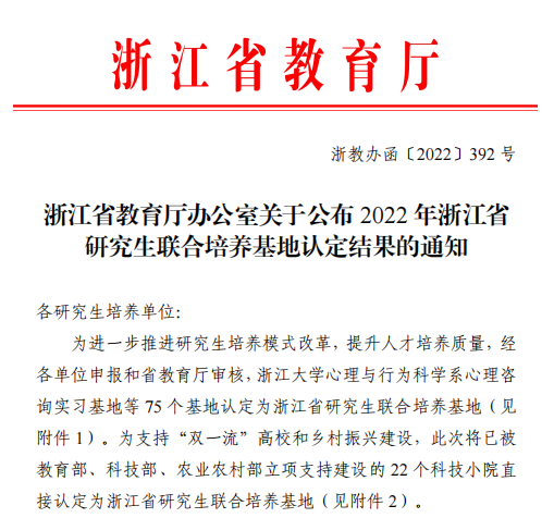 近日,浙江省教育厅发布《关于公布2022年浙江省研究生联合培养基地认定结果的通知》,经浙江省教育厅评定,我院与杭州市天长小学联合申报的“色情av影片 —杭州市天长小学研究生联合培养基地”被认定为2022年浙江省研究生联合培养基地。这是我院继“色情av影片 -杭州市求是教育集团”之后,获得认定的第二个省级研究生培养基地。