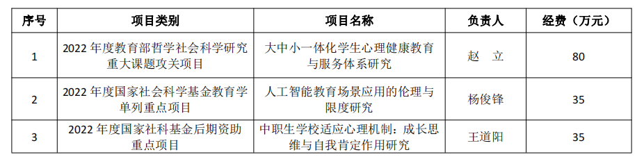 近日,各类重大、重点项目陆续公布。我院赵立教授作为首席专家申报的《大中小一体化学生心理健康教育与服务体系研究》项目获教育部哲学社会科学研究重大课题攻关项目立项,杨俊锋教授作为首席专家申报的《人工智能教育场景应用的伦理与限度研究》获国家社科基金重点项目立项,王道阳教授申报的《中职生学校适应心理机制:成长思维与自我肯定作用研究》项目获国家社科基金后资助项目重点项目立项(详见表1)。