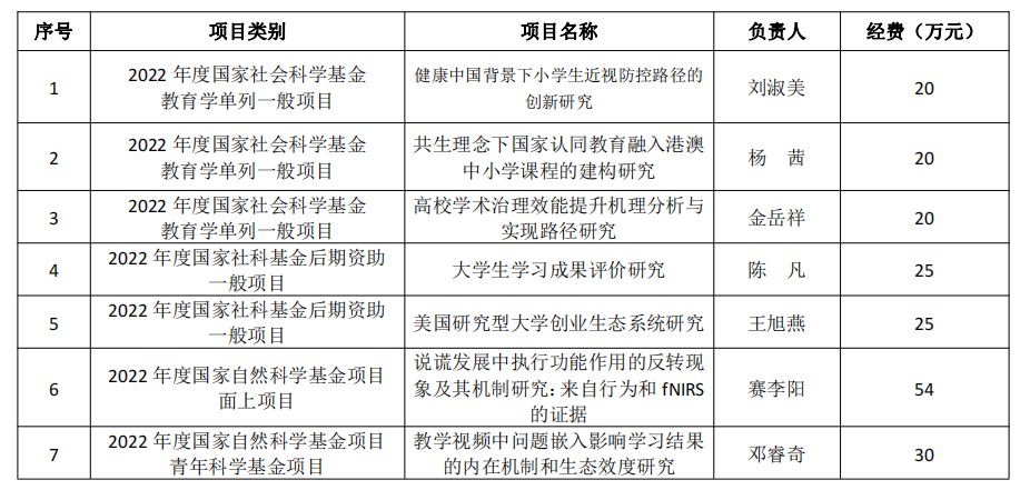 近年来,学院高度重视科学研究工作,不断加快人才队伍建设,以项目申报为指引,通过学术研讨、专家讲座、学术交流等形式,开展多元化的科学研究活动。2022年我院在国家级项目(尤其是重大、重点项目)上立项成果丰硕,离不开学院党政班子的高度重视和大力支持,更离不开全院教师们的共同努力。接下来,学院将在学校相关部门的支持下持续加大高水平科研项目培育力度,为后期更多高层次项目、高水平成果、高级别获奖的涌现奠定基础,并将继续积极配合学校文科建设,稳步提升我院课题申报质量和层次,持续推出高水平科研成果,助推学院教育学和心理学两大学科的高质量发展。