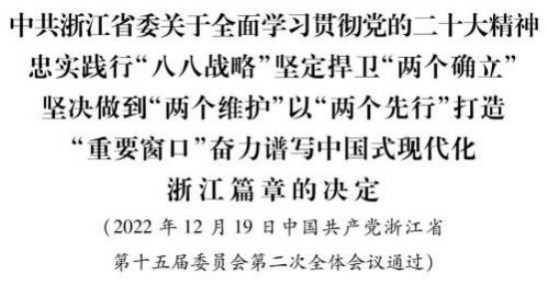 中国共产党浙江省第十五届委员会第二次全体会议,全面学习贯彻党的二十大精神,紧密结合省第十五次党代会部署,就动员全省上下高举中国特色社会主义伟大旗帜,全面贯彻习近平新时代中国特色社会主义思想,坚定捍卫“两个确立”、坚决做到“两个维护”,紧跟总书记、勇扛新使命、奋进新征程,一以贯之忠实践行“八八战略”,以“两个先行”打造“重要窗口”,奋力谱写中国式现代化浙江篇章,作出如下决定。