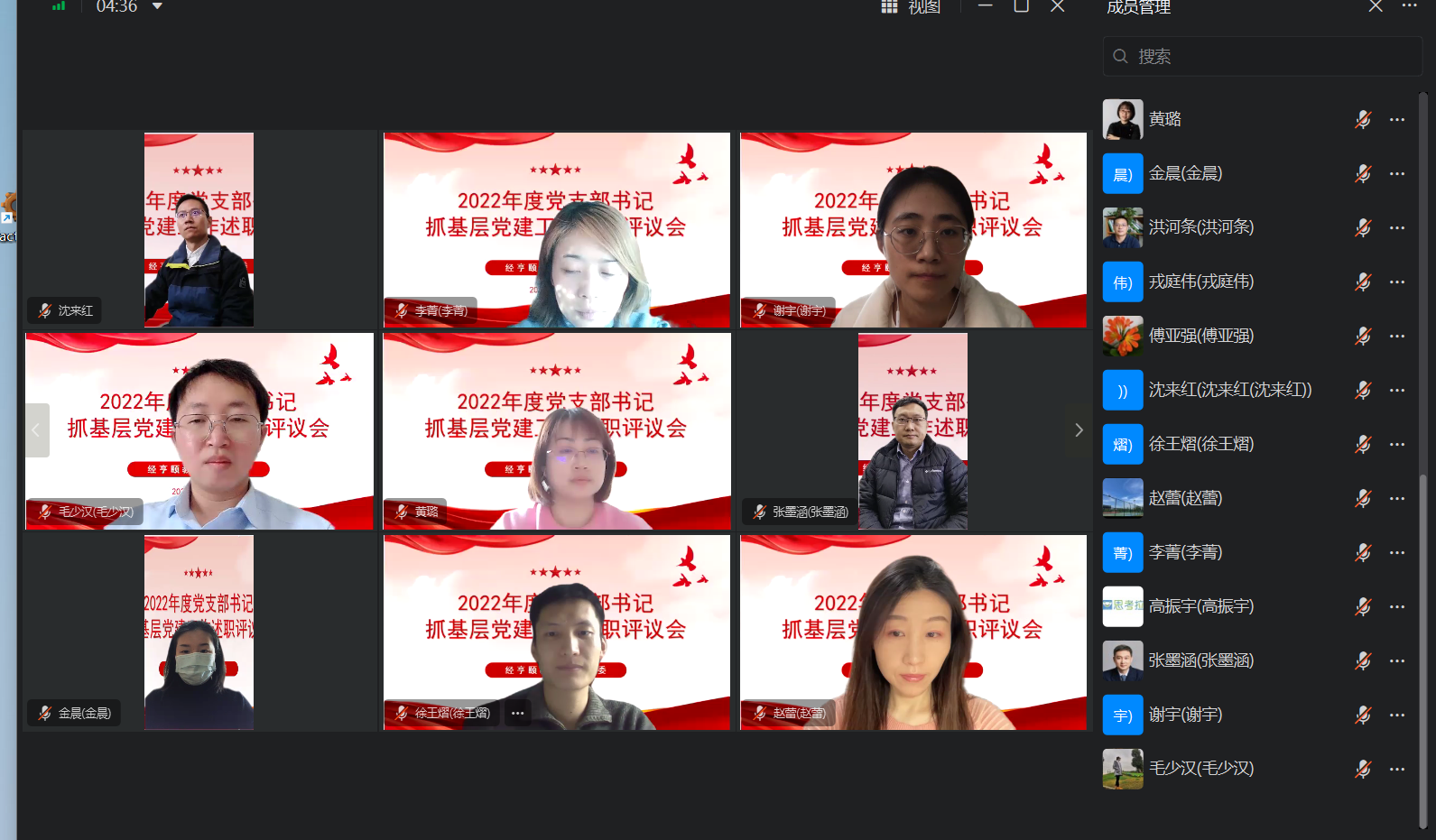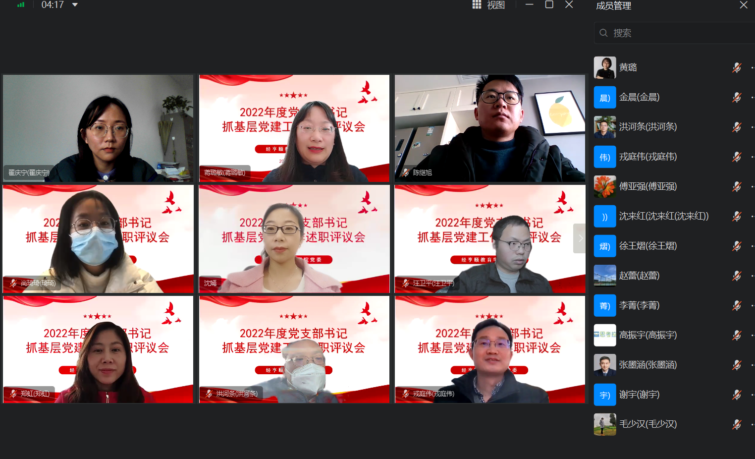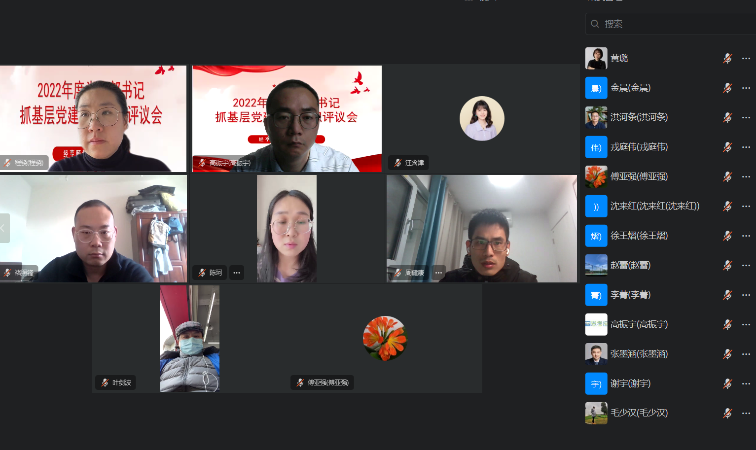 1月9日下午,学院党委组织召开2022年度党支部书记抓基层党建工作述职评议会,全面总结2022年工作,谋划部署2023年工作,并对各党支部书记抓基层党建工作进行述职评议。学院党委书记蒋璐敏、副书记沈嫣以及学院23名教工党支部和学生党支部书记参加会议。