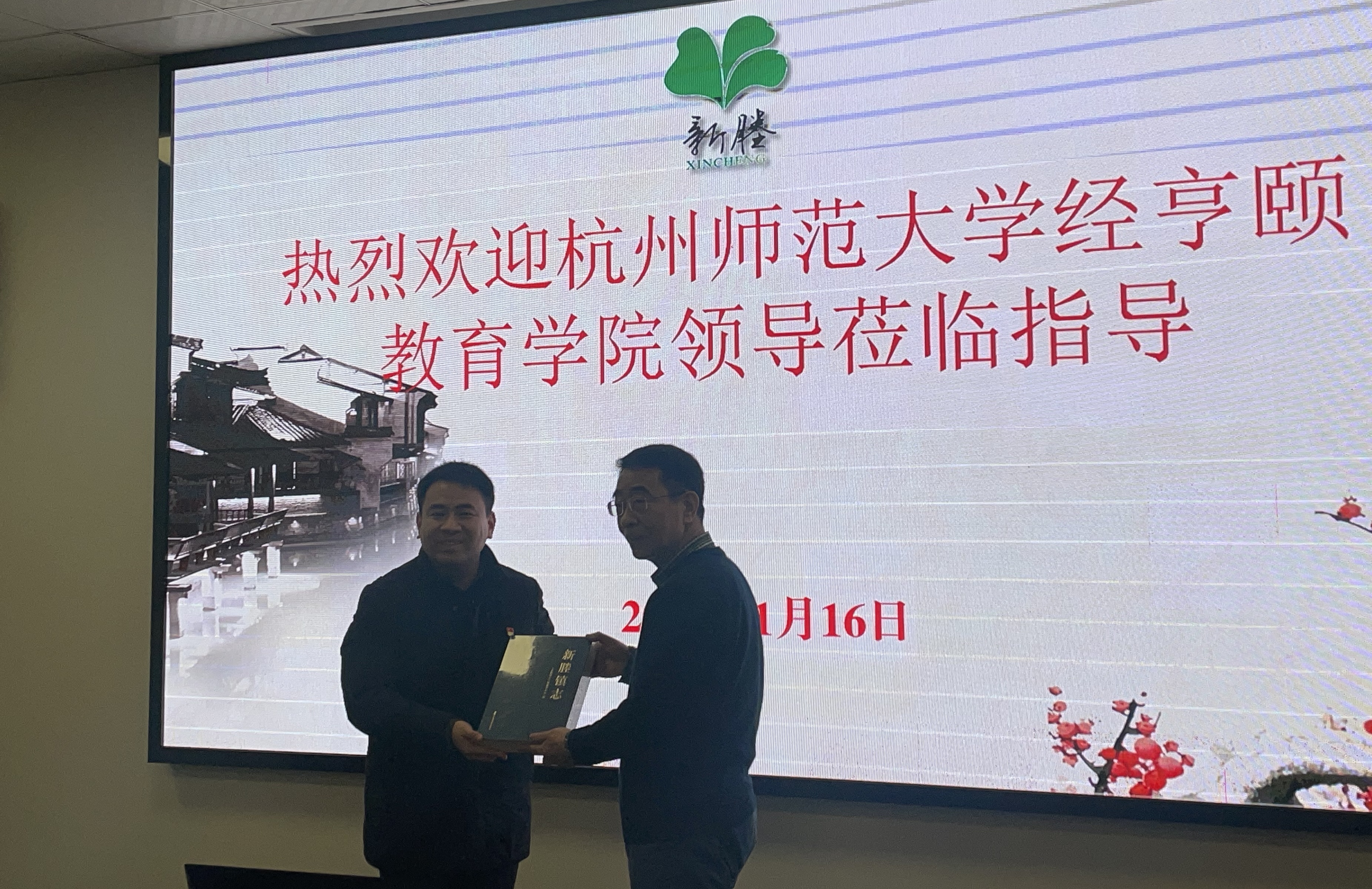 张斌贤代表学院接受了翁松刚代表新塍镇赠送的《新塍水乡风貌图》、《新塍镇志》。