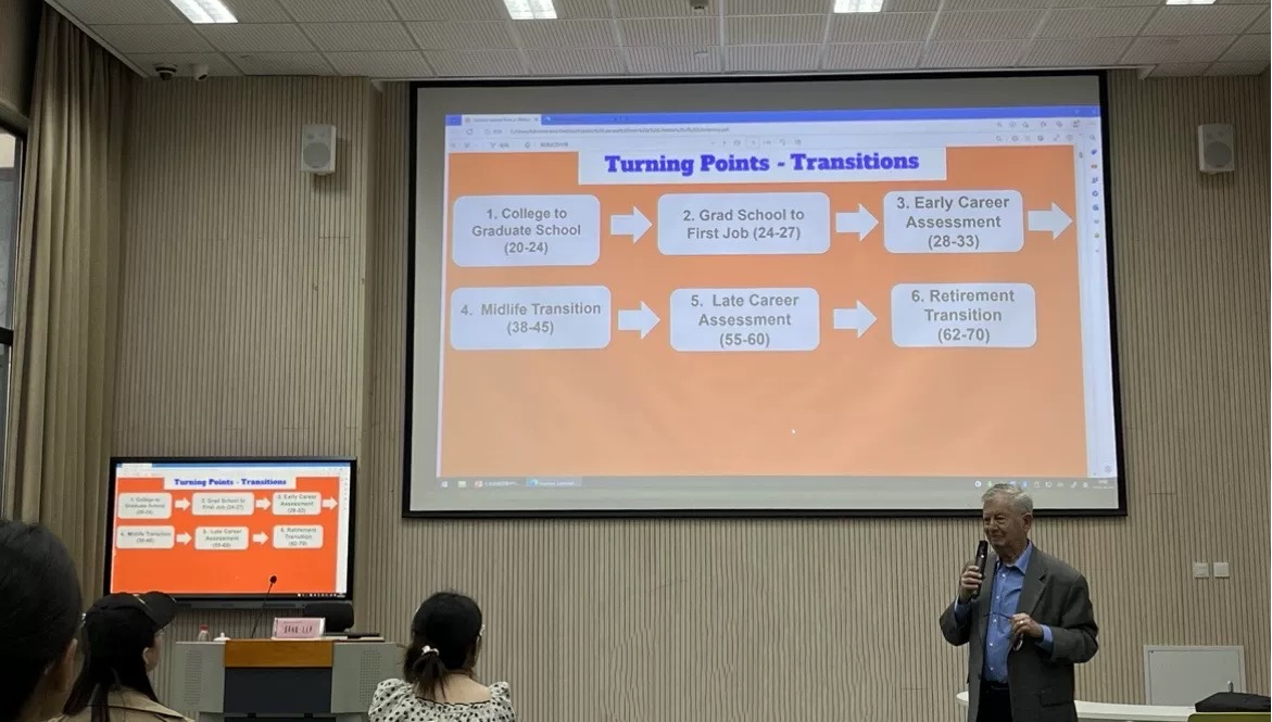 许建美教授首先代表学院师生表达了对莱昂纳德·瓦克斯教授的热烈欢迎,并简短介绍了莱昂纳德·瓦克斯教授的相关成就。讲座开始后,莱昂纳德·瓦克斯教授以人生的几个重要转折点为线索,展开本次讲座:college to graduate school (20-24), grad school to first job (24-27), early career assessment (28-33), midlife transition (38-45), late career assessment (55-60), retirement transition (62-70)