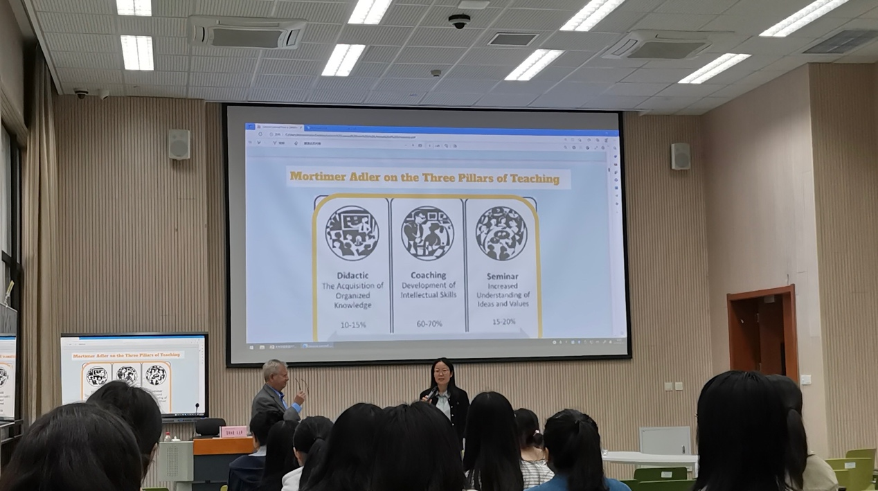 在讲座中,莱昂纳·瓦克斯教授展示Mortimer Adler提出的三大教学支柱,它们分别是didactic, coaching, seminar。他指出,教学中讲授法占比太高,缺乏足够的一对一辅导(coaching)和研讨,因此提出师生间需要更多的沟通交流。同时,莱昂纳德·瓦克斯教授分享道,他去参加各类国际会议的目的不仅是交流学术,还为了认识更多志同道合的人,并引用了中国的一句古话——有朋自远方来,不亦乐乎。他在讲座中还分享了论文写作和时间管理的经验,强调了写作前阶段准备的重要性。最后,他指出,许多学生羞于在课堂上表达自己的观点。因此提出可以采用小篮”的办法,让学生把写好观点的纸条放“小篮子”里,教师再抽取观点、就这个点再与学生进行交流。