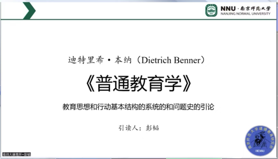 开幕式之后,南京师范大学道德教育研究所讲师、德国教育学研究中心负责人彭韬博士进行了简扼而全面的引读。首先,彭博士对这本专著的题目进行了解读,他认为,“普通教育学”旨在对一般性的教育学原理进行论证,因而其论域超越各种教育职业和各个种类的教育,对具体的、复杂的教育现象进行高度概念化和理论化;“系统的”表示这本专著的内容是成为一个体系的,各部分之间存在有机的联系,共同组成一个思想系统;“问题史的”表示本纳的教育学思想体系并不走向封闭,反而是完全开放的,总是从问题史中来,再回到问题史的发展中去;“引论”表示出这本书的某种“教材”性质。接着,以“《普通教育学》:寻求教育自身逻辑”为题,彭博士从六个方面展开分享:第一,普通教育学的困难性、必要性和可能性;第二,教育实践在人类总体实践中的地位;第三,教育思想和行动的原则;第四,系统教育科学的行动理论问题;第五,教育实践的行动维度。最后,彭博士总结了普通教育学的论证诸层面,分别是普通的行动理论、教育行动和教育思想的基本概念、教育行动理论、专门的教育行动形式和教育维度的理论。