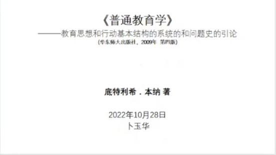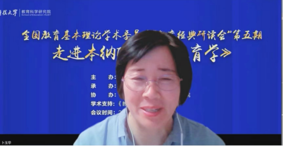 引读之后,华东师范大学基础教育改革与发展研究所副所长卜玉华教授首先进行了呼应。卜教授回应了彭博士对《普通教育学》题目的解读,她认为本纳的“普通”不是大而全的概论,而是带有共识性、基础性、通识性、普遍性的含义。其次,卜教授对全书主体结构及逻辑关系进行了分享,她认为核心部分是四个层面,分别是本体论、理论基础、基础理论、行动论。其中,教育性和教养性的主题结构是本书非常深刻的内容,具体包含六个解释维度,分别是交往的生活世界的维度、科学内的维度、历史—社会的维度、意识形态批判的维度、超验的维度、实践哲学的维度。接着,卜教授分享了自己的学习感受:第一,要从历史问题史的视角理解现代教育的使命与原则;第二,要把教育放在个人与社会的关系框架下确定内外原则,为教育找到普遍性,两个基础性原则是教育的内在原则,两个协调性原则是处理教育与社会的关系;第三,赫尔巴特回答了现代社会的教育学问题,故而被认为是“现代教育学之父”,本纳十分赞赏赫尔巴特;第四,本纳具有深厚的理论功底与历史透视力,对知识与经验的性质等具有非常深刻的理解。最后,卜教授对我们如何更好地读懂这本书提出了两点建议:第一,读懂书中的例子;第二,先读《教育和道德:从古希腊到当代》来帮助理解。