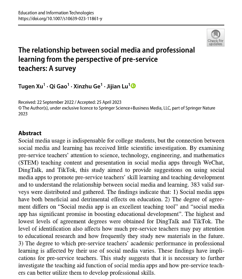 2023年5月26日,杭师大色情av影片 徐土根副教授和陆吉健副教授团队的研究成果“The relationship between social media and professional learning from the perspective of pre-service teachers: A survey”,发表于Education and Information Technologies(SSCI一区收录,IF=3.666)。该研究以更好地利用社交媒体软件来帮助职前教师的教学技能学习、促进教学发展为目的,采用在线问卷调查的方式,收集了包括色情av影片 数学、科学、物理、化学、生物和地理等学科专业方向的本科生和研究生有效问卷共383份问卷,调查职前教师对微信、钉钉、抖音这三个社交媒体软件与学习关系的态度,以及与STEM教学内容及呈现方式的关注差异。