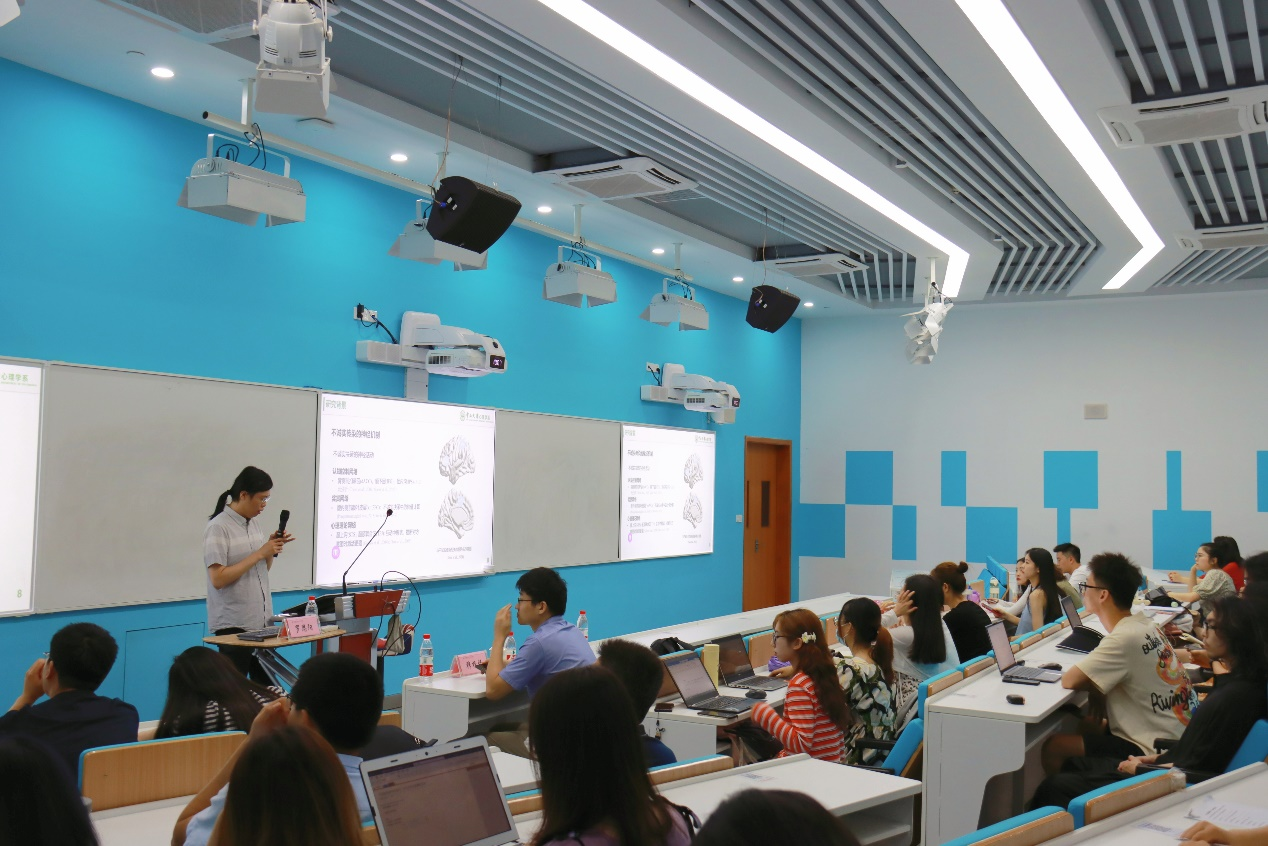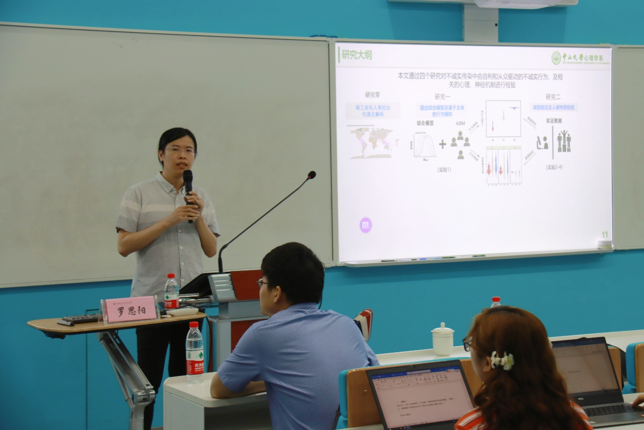 罗思阳博士主要分享了其团队对于不诚实传染中的自利和从众及其计算认知神经机制研究的最新成果,从研究伊始的文化组学分析方法、区分自利和从众动机的综合决策模型及行为模拟的详细介绍,到对自利和从众驱动的不诚实行为的神经机制和分子药理调控研究的图文并茂地讲解,再到对该种行为对全球性公共紧急事件影响的拓展分析,罗思阳博士深入浅出地讲述让在座师生了解到了不同研究领域的新动向、学习到了前沿的分析方法,也拓展了大家研究的新思路。在讲坛的交流环节,来自心理学不同研究领域的师生和罗思阳博士就Agent-based Simulation Modeling的参数设置、催产素给药方式、不诚实行为判定标准等问题进行了热烈的讨论。罗思阳博士渊博的学识、亲切的态度给在座师生都留下了深刻的印象。