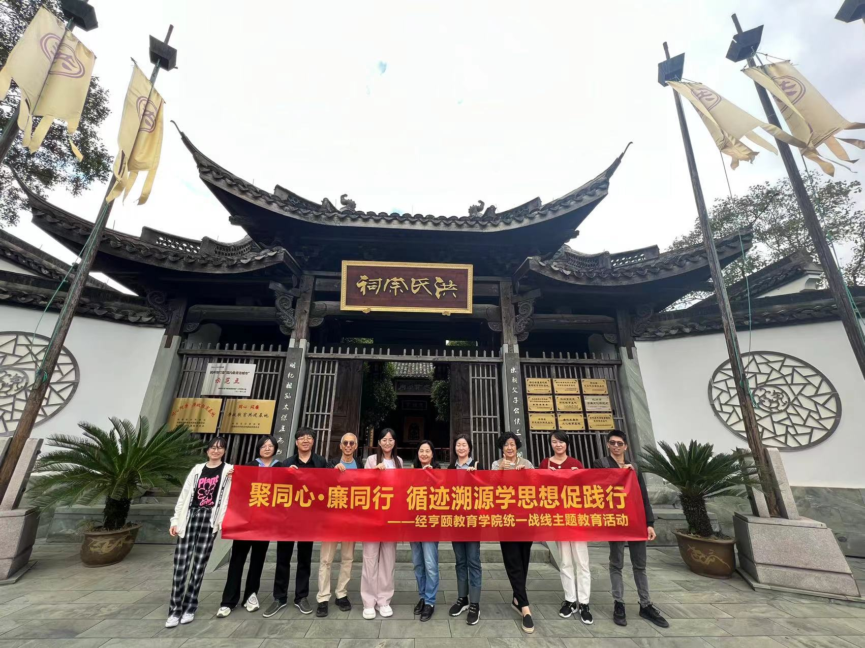 学院一行首先参观了洪氏宗祠,洪氏家族史称“钱塘望族”,以“宋朝父子公侯三宰相,明纪祖孙太保五尚书”而传世,形成了“孝以事亲,义以睦族,敬以持己,恕以及物”洪氏祖训。在讲解员的带领下,老师们通过游览洪氏宗祠和钱塘望族文化展馆,感悟源远流长的家族传承,观看家风、廉政文化宣传视频,感悟清正德义的洪氏家风;诵读洪氏家规祖训,感悟忠孝节义的洪园故事;乘坐清风号专线,“沿着总书记的足迹学思想”,登高观荷,感悟出淤泥而不染的清廉之风。