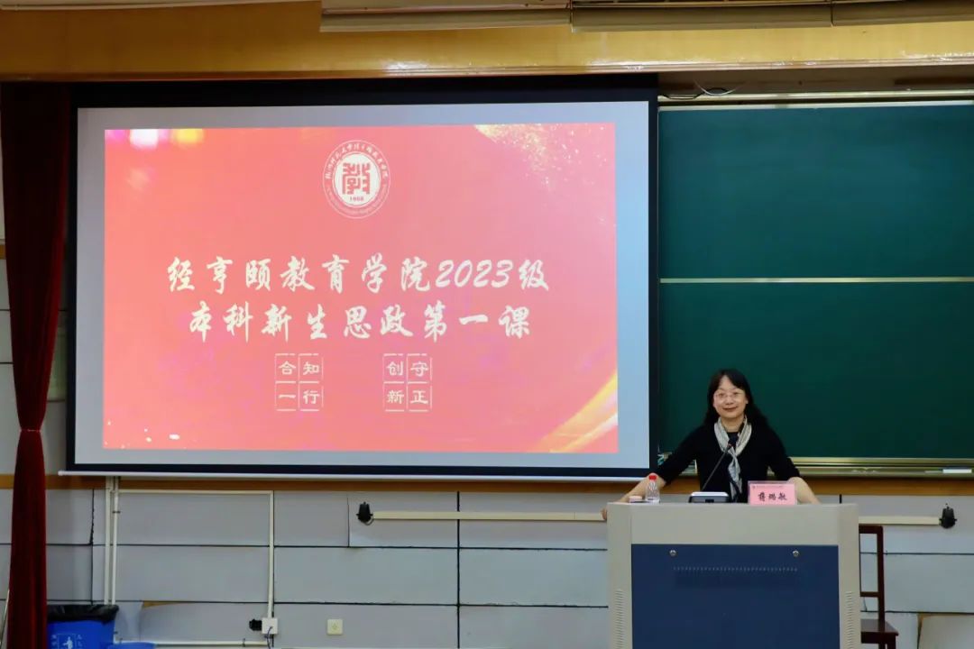 11月8日下午,学院党委书记蒋璐敏在下沙校区D号楼223教室为我院2023级本科新生讲授“思政第一课”。本次“思政第一课”题目为《传承红色基因,赓续师范文脉——肩负教育强国使命,争做新时代卓越青年》,2023级新生辅导员黄哲浩、汪康琳和学前教育(师范)专业、教育技术学(师范)专业、特殊教育(师范)专业新生参加。