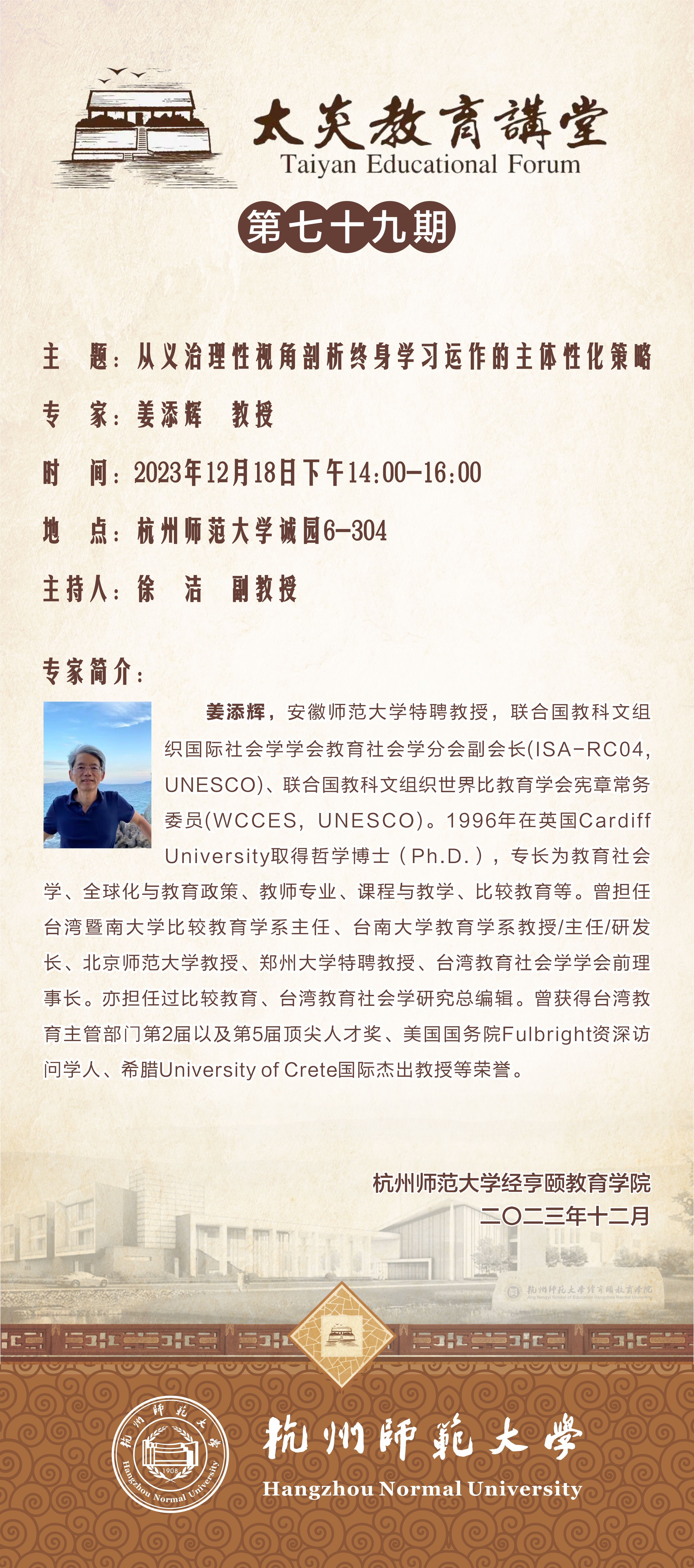 姜添辉,安徽师范大学特聘教授,联合国教科文组织国际社会学学会教育社会学分会副会长(ISA-RC04, UNESCO)、联合国教科文组织世界比教育学会宪章常务委员(WCCES, UNESCO)。1996年在英国Cardiff University取得哲学博士(Ph.D.),专长为教育社会学、全球化与教育政策、教师专业、课程与教学、比较教育等。曾担任台湾暨南大学比较教育学系主任、台南大学教育学系教授/主任/研发长、北京师范大学教授、郑州大学特聘教授、台湾教育社会学学会前理事长。亦担任过比较教育、台湾教育社会学研究总编辑。曾获得台湾教育主管部门第2届以及第5届顶尖人才奖、美国国务院Fulbright资深访问学人、希腊University of Crete国际杰出教授等荣誉。